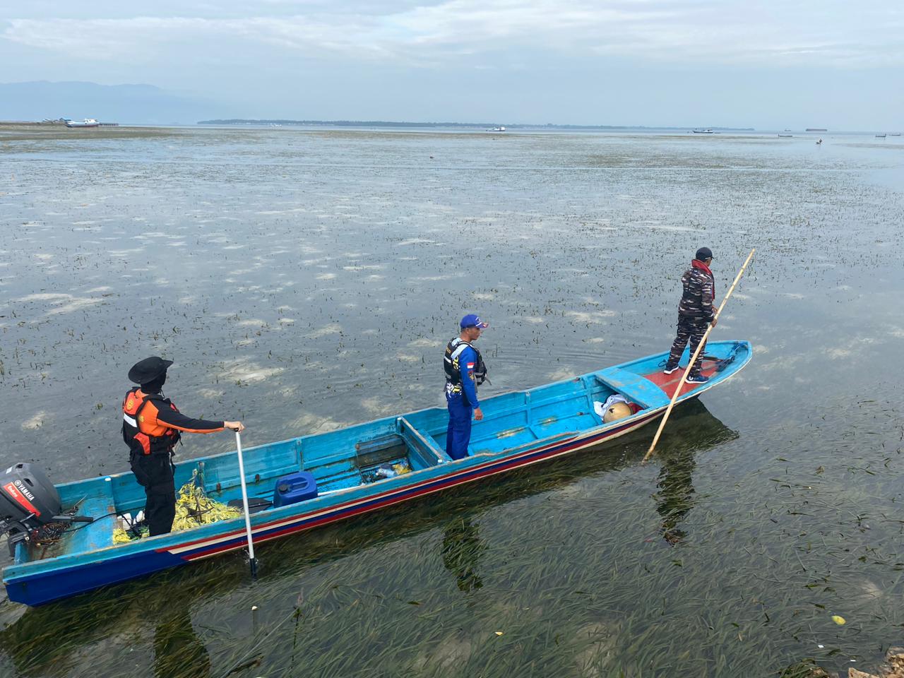 Koordinator lapangan, Siwanto, menjelaskan bahwa pencarian dilakukan dengan menggunakan perahu katinting milik warga setempat karena kondisi air laut sedang surut.